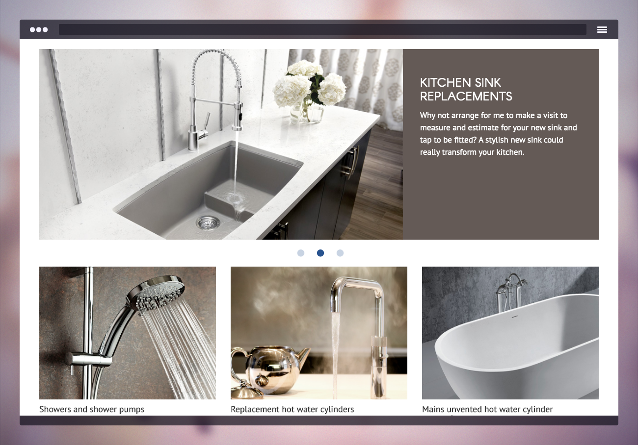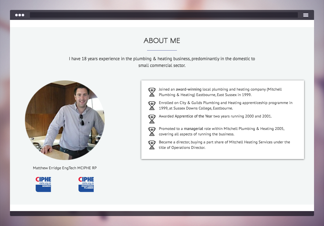 Elegant, single page site for this highly experienced plumbing and heating engineer.